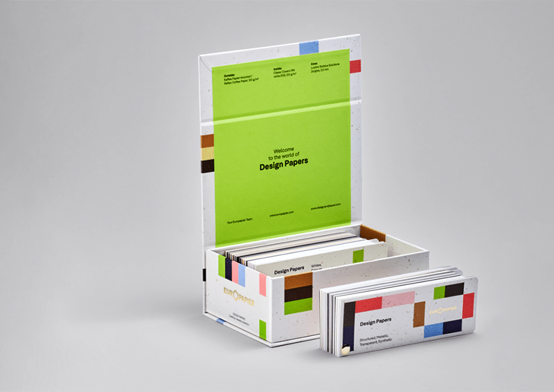 Prizadevali so si obuditi vsebino kataloga, njegov bogat nabor raznolikih Design papirjev. Izbrane barvne kombinacije na škatli zagotavljajo možnost vpogleda v barvno paleto, ki tistega, ki jo bo odprl, čaka pod pokrovom. Kockasti dizajn predstavlja igro med analognim in digitalnim, ki se v vsakem procesu oblikovanja srečujeta, zato se na škatli homogeno združujeta pogumna odločitev za uporabo geometrijskih grafičnih elementov in organski vzorec papirja Coffee.