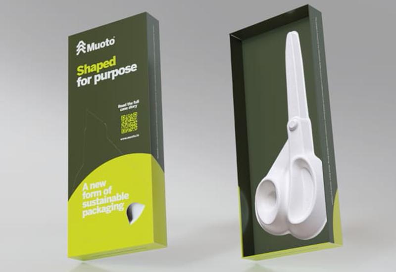 Notranja embalaža Muoto 3D v kombinaciji z zložljivo škatlo iz kartona Metsä Board omogoča pakiranje fiksno pakiranje kompleksnejših oblik, kot so škarje. (Vir: Metsä Board)