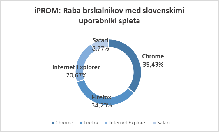 o med slovenskimi internetnimi uporabniki priča stabilni in stalni rasti priljubljenosti brskalnika Chrome (Google), ki mu je januarja letos uspelo prehiteti Firefox (Mozilla). Tako je v maju Chrome zabeležil že 35,43-odstotni delež, Firefox pa le še 34,23-odstotnega.Pada tudi priljubljenost brskalnika Internet Explorer (Microsoft). Iz nekdaj monopolističnega deleža ga po aktualnih podatkih sedaj uporablja le še 20,67 odstotka oziroma slaba četrtina slovenskih uporabnikov.